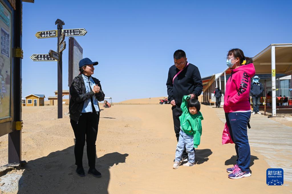 4月30日,在银肯塔拉生态旅游区,李芳(左一)在接待游客。