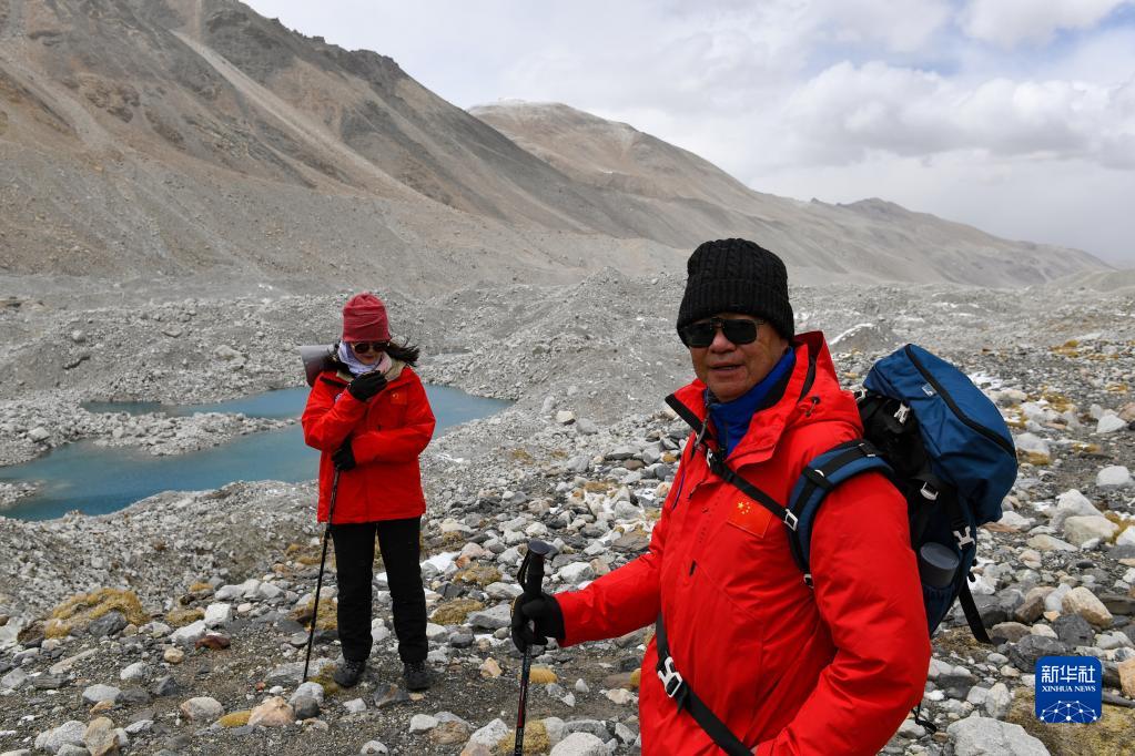 朱彤(右)和科研人员在珠峰登山大本营和绒布冰川间徒步穿梭(5月1日摄)。