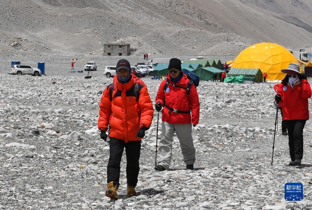 朱彤(左二)和科研人员在珠峰登山大本营和绒布冰川间徒步穿梭(5月1日摄)。