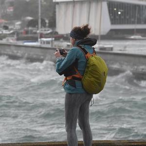 这是2021年1月19日,一名女子在新西兰首都惠灵顿的岸边拍摄海浪(资料照片)。