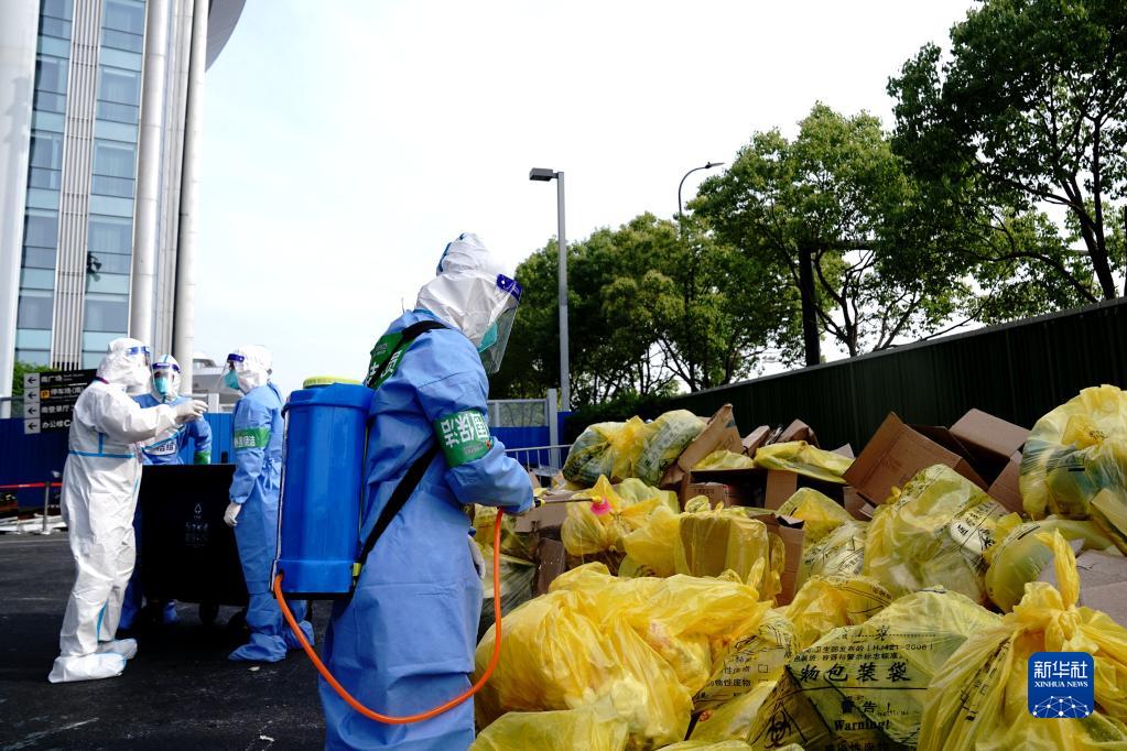 5月2日,在国家会展中心(上海)方舱医院外,工作人员对涉疫垃圾存放点进行消杀。
