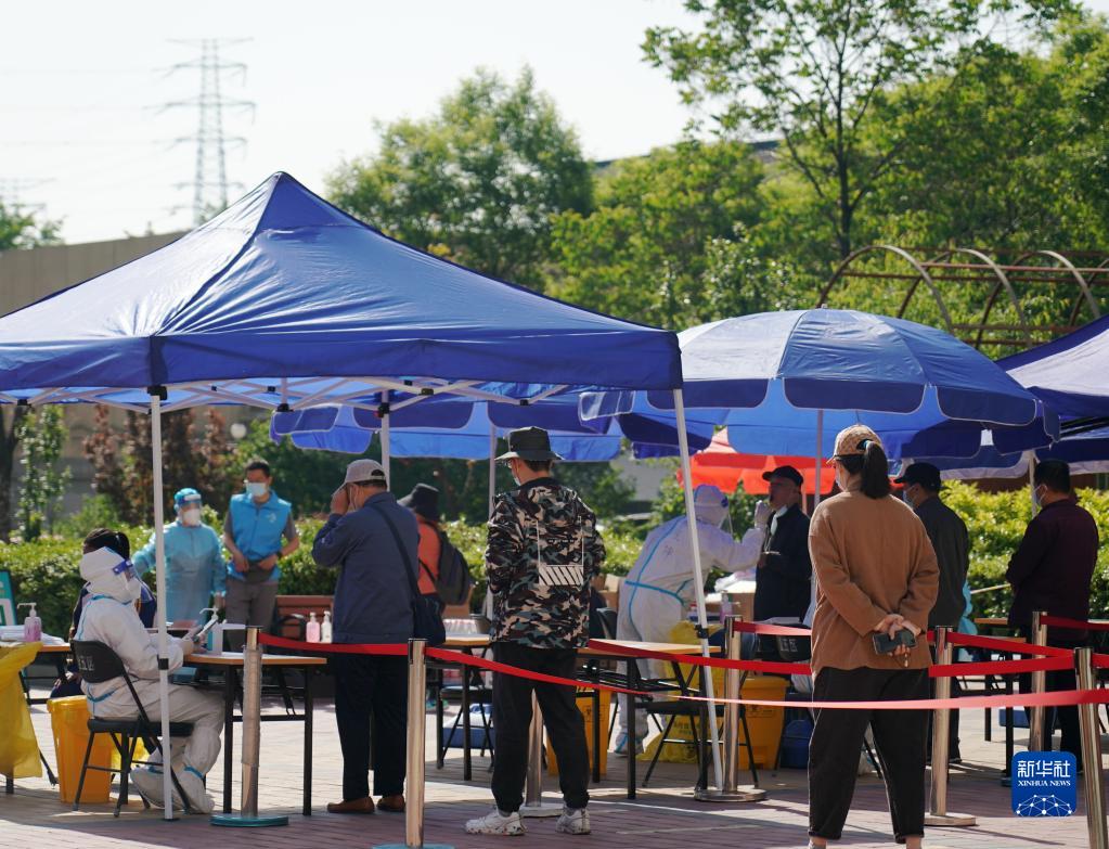 5月3日,市民在石景山区金顶街街道金五区社区文化广场核酸检测点排队进行核酸采样。