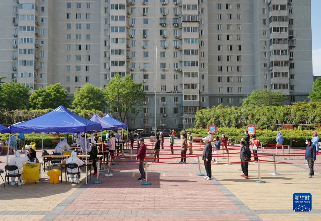 5月3日,市民在石景山区金顶街街道金五区社区文化广场核酸检测点排队进行核酸采样。