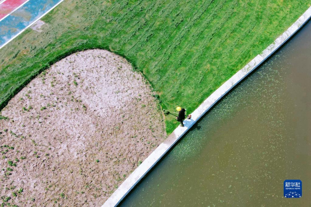 5月3日,在江苏省如皋市城南街道五里港河道上,工作人员在修剪草皮(无人机照片)。