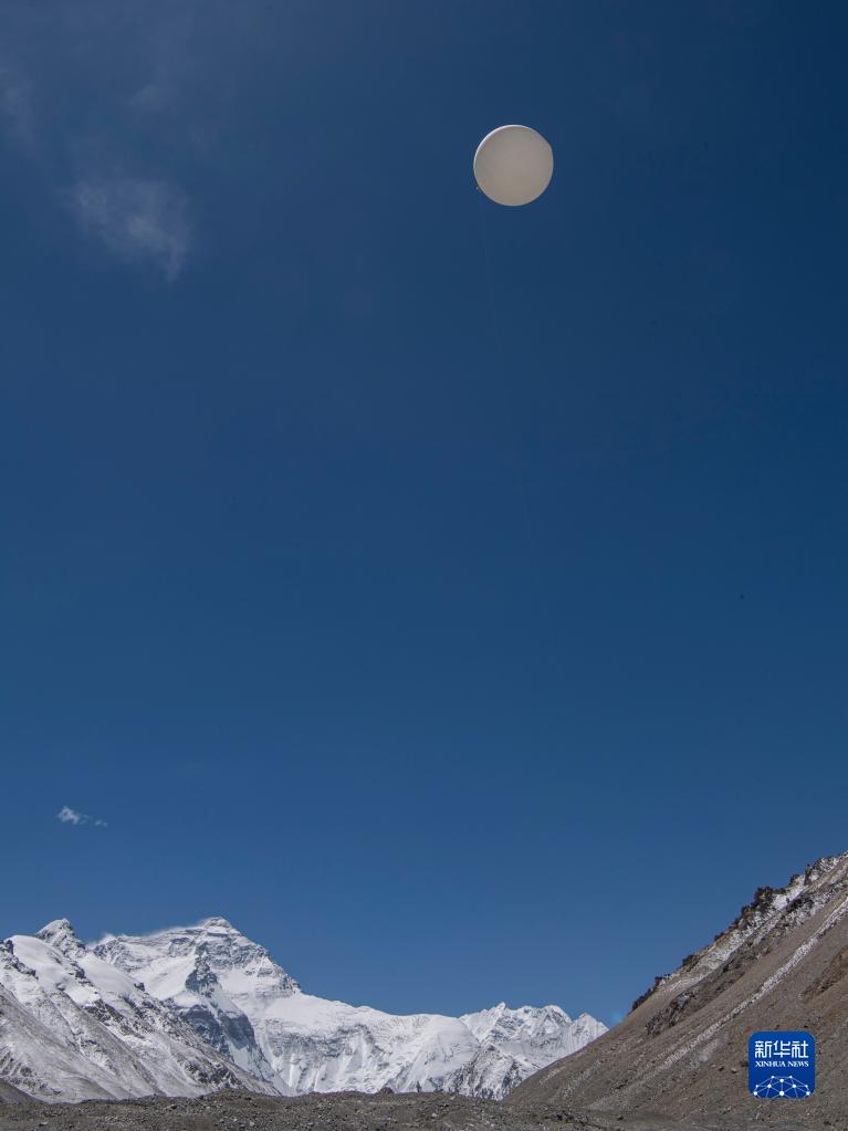 这是在珠峰登山大本营,科研人员施放的大气臭氧探空气球(5月3日摄)。