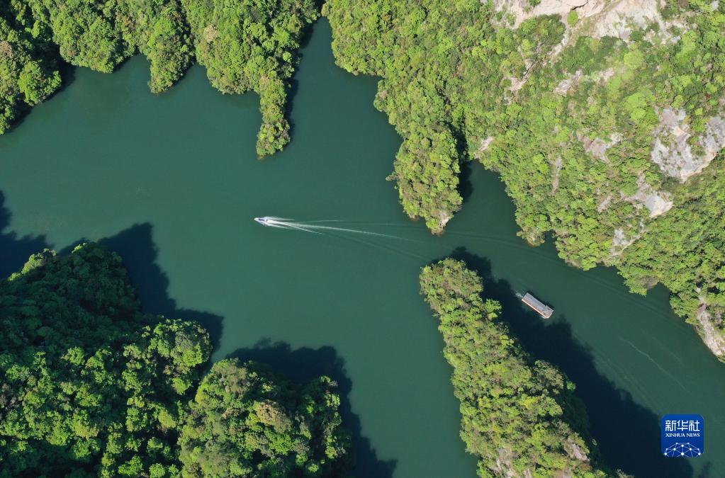 5月3日,游人在湖南张家界市武陵源区宝峰湖景区乘船游览(无人机照片)。