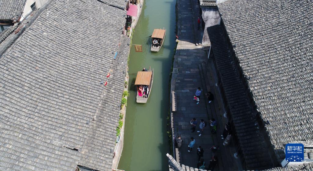 5月3日,游客在浙江省湖州市德清县新市古镇乘船游玩(无人机照片)。