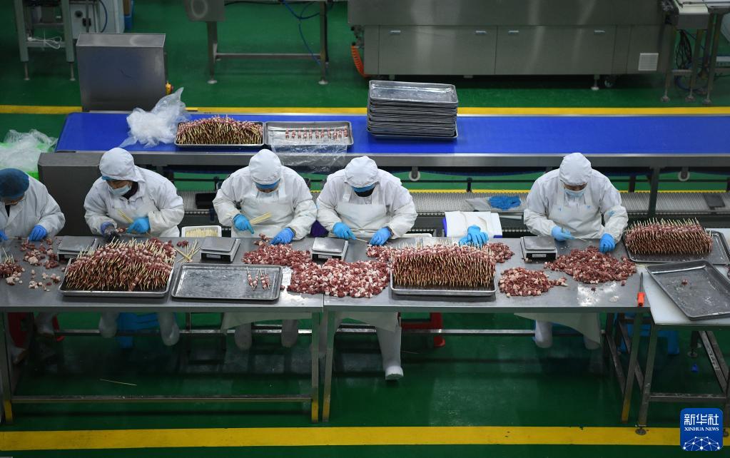 盐池滩羊产业发展集团工人在流水线上分拣羊肉(5月2日摄)。