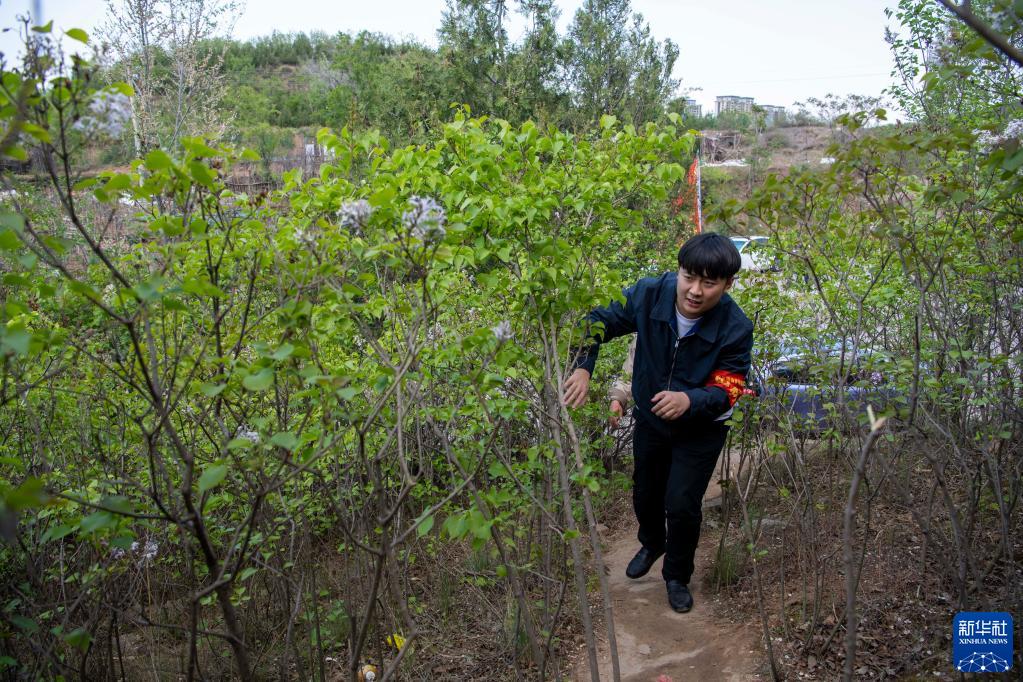 5月3日,方昱淋在太原市万柏林区白家庄街道桃杏村的山上进行护林防火巡查。