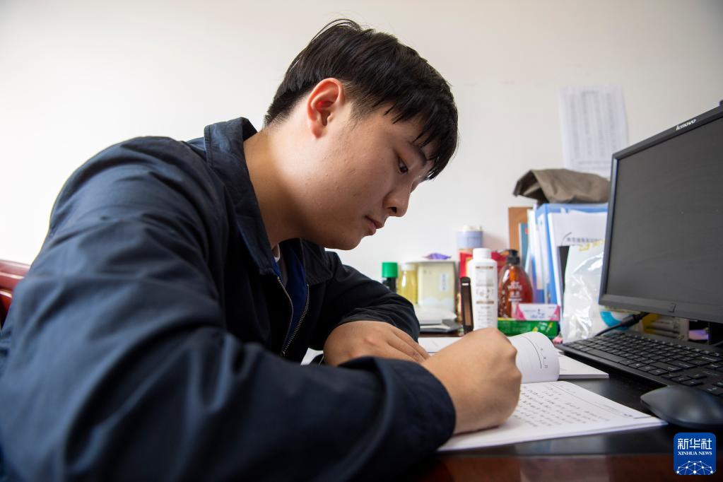 5月1日,在太原市万柏林区白家庄街道桃杏村,结束当日工作的方昱淋在办公室写工作日志。