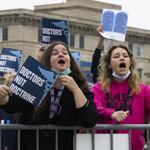 5月3日,在美国华盛顿,支持和反对堕胎权的人们在美国联邦最高法院外集会。