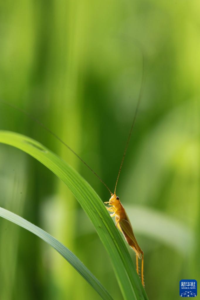4月30日,昆虫在云南省西双版纳傣族自治州景洪市澜沧江湿地的草丛中舞动触须。