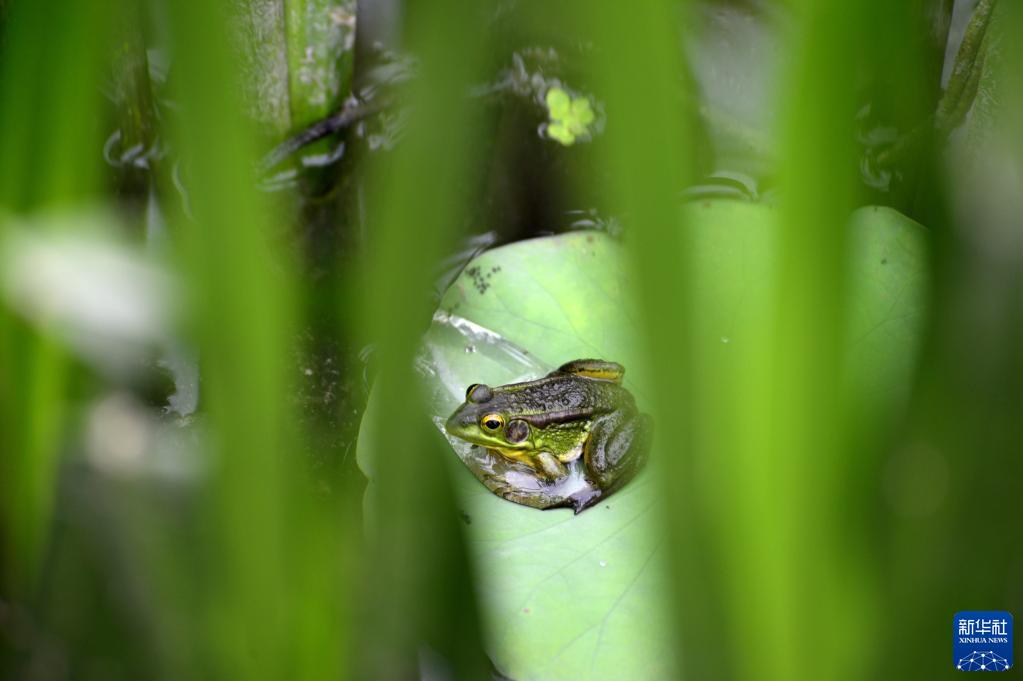 4月26日,在河南省驻马店市汝南县西湖公园内,一只青蛙在荷叶上栖息。