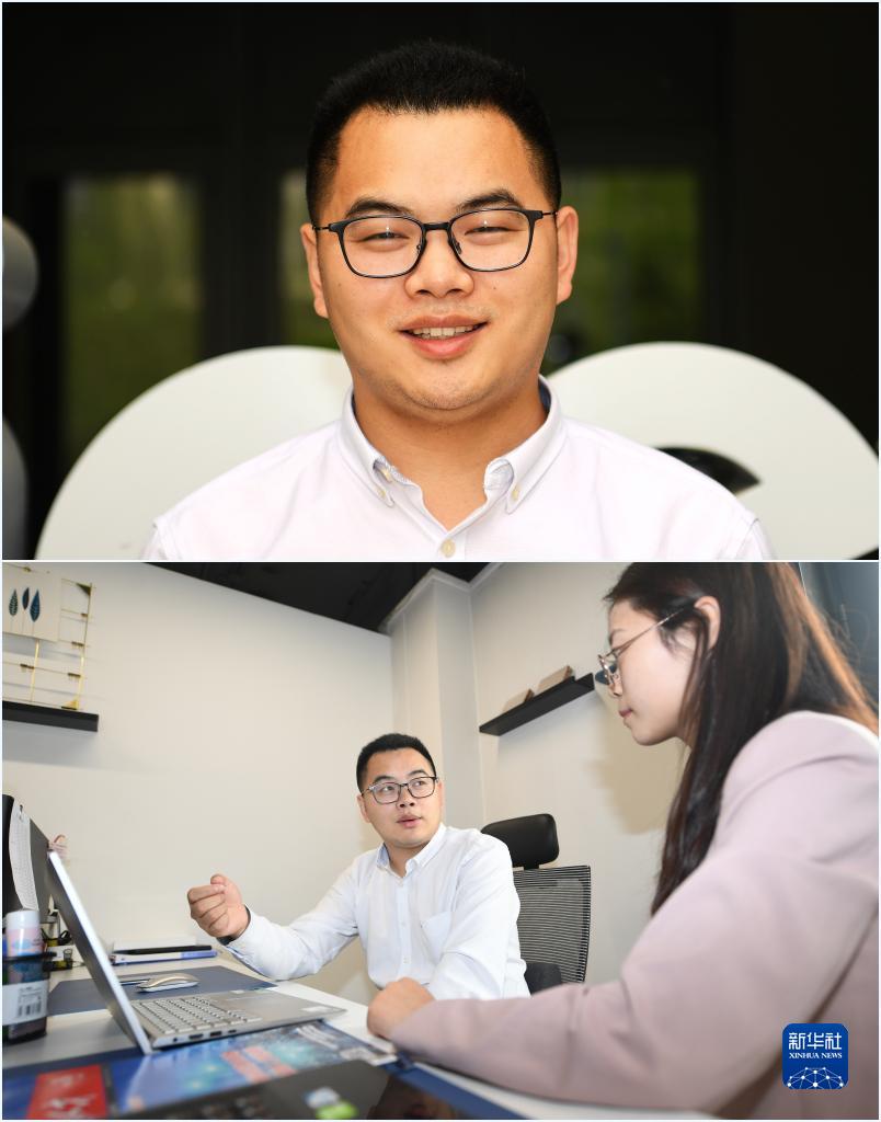 拼版照片:上图为雄安新区党群工作部人才工作组组长唐普亮(4月21日摄);下图为唐普亮在雄安市民服务中心办公室与同事交流(4月21日摄)。