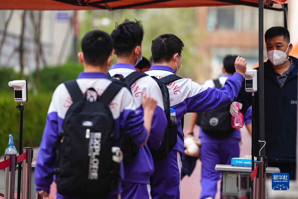 5月5日,东北师范大学附属中学高三年级的学生测量体温后进入校园。