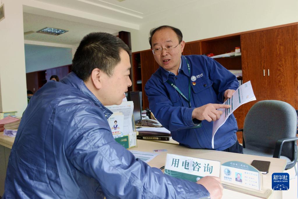 钱海军(右)在慈溪舒苑社区现场进行业务受理,为社区居民解答用电问题(2015年4月23日摄)。
