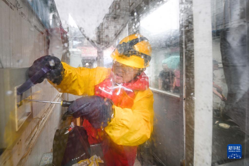 在台风“烟花”来袭期间,国网慈溪市供电公司职工钱海军在社区帮助社区解决电力问题(2021年7月25日摄)。