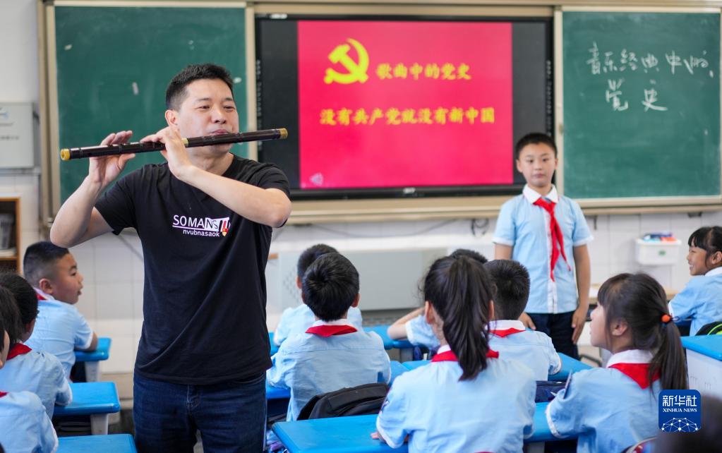 5月5日,在重庆市九龙坡区铁路小学五年级一班的课堂上,音乐老师马驰为学生们吹奏红色经典乐曲《没有共产党就没有新中国》。