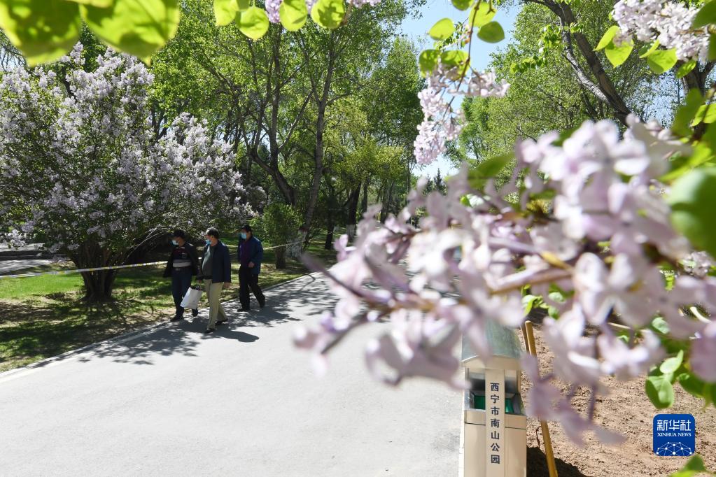 5月5日,市民在丁香花盛开的西宁市南山公园散步。