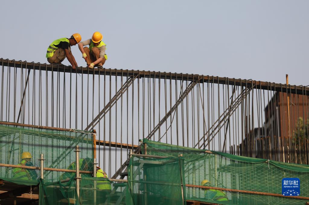 5月5日,工人在河北省石家庄市维明大街与南二环连通工程工地施工。