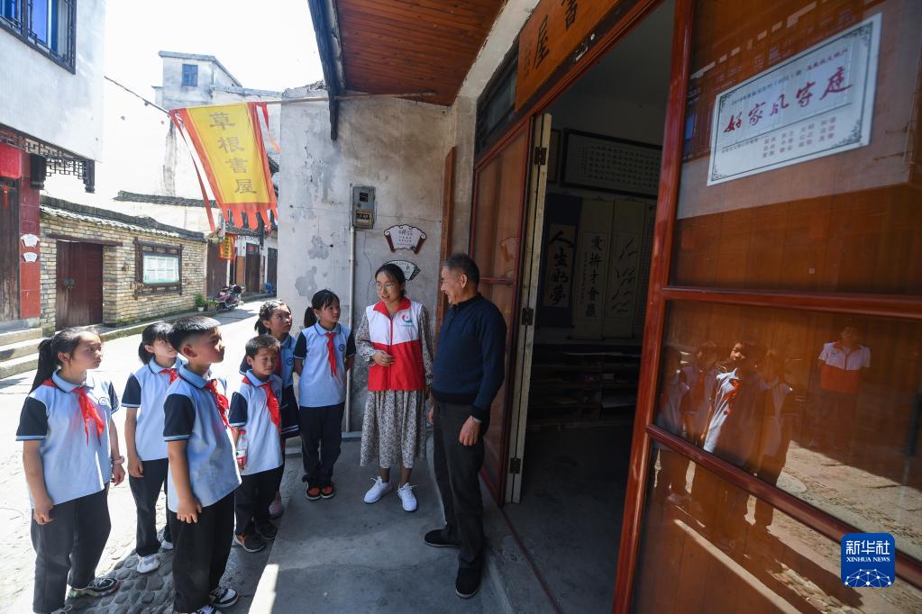 5月6日,河桥镇的纪检干部(右二)在河桥老街给河桥镇小学学生介绍一户好家风家庭的事迹。