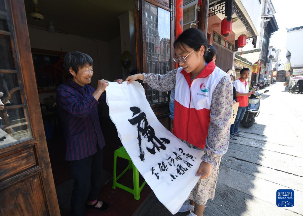 5月6日,河桥镇的纪检干部(右)将清廉家风书法作品赠送给河桥古镇老街上的居民。
