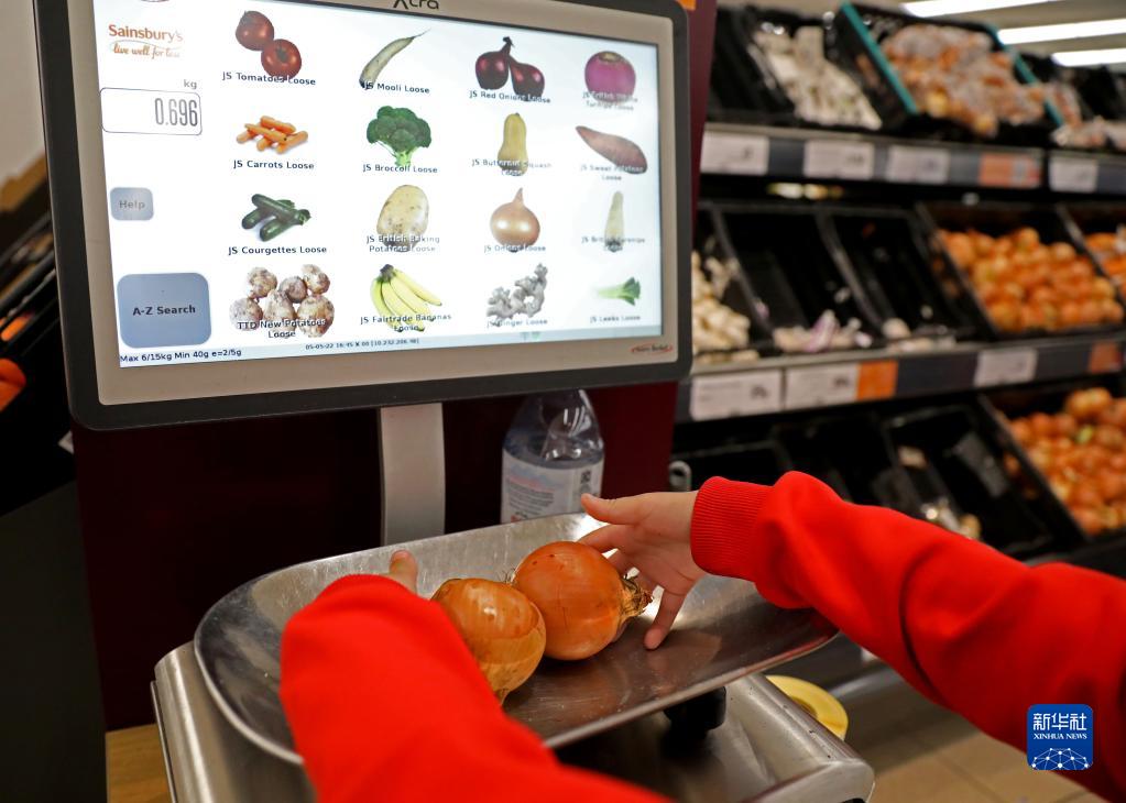 5月5日,在英国伦敦一家超市,一名顾客为食物称重。新华社记者李颖摄