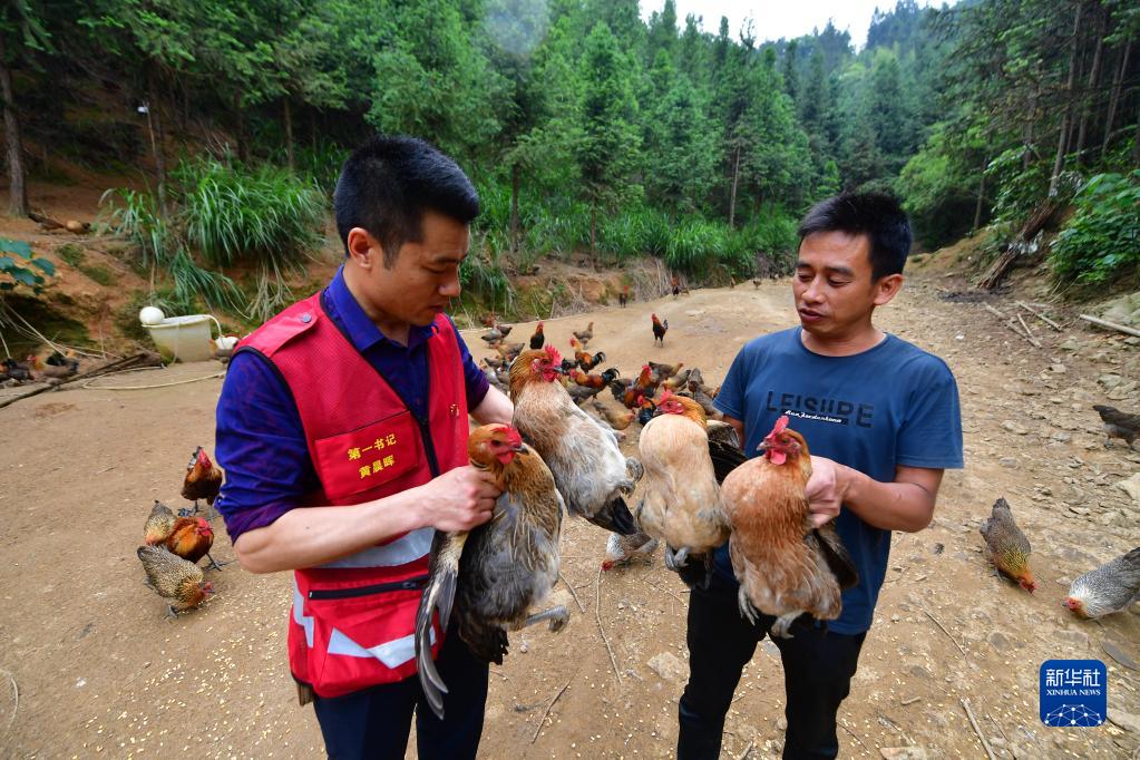 5月6日,黄晨晖(左)和村民在查看大坡飞鸡生长情况。