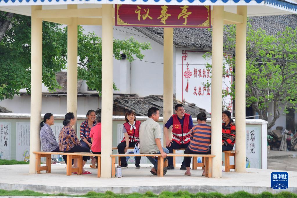 5月6日,黄晨晖(右三)、驻村工作队员江益芝(右五)在议事亭和村民们交流。