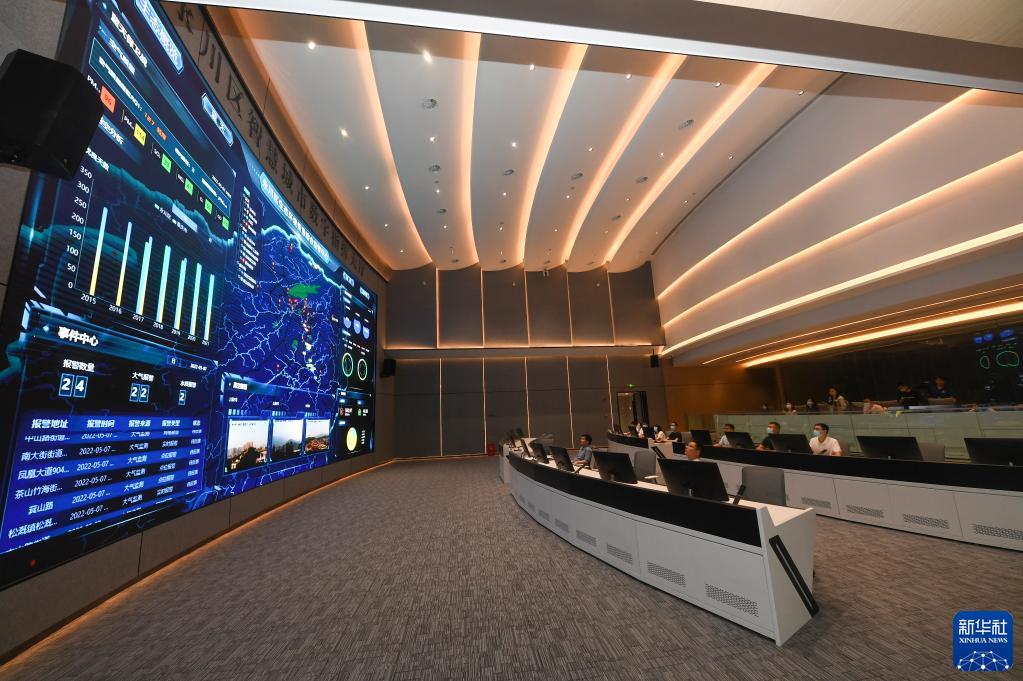 5月7日,在重庆市永川区智慧城市数字指挥大厅,工作人员利用生态环境智慧综合监管平台进行监测、分析。