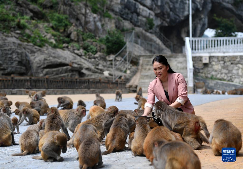 5月7日,在广西凤山县乔音乡久隆村巴腊屯,一名游客在喂猴子。