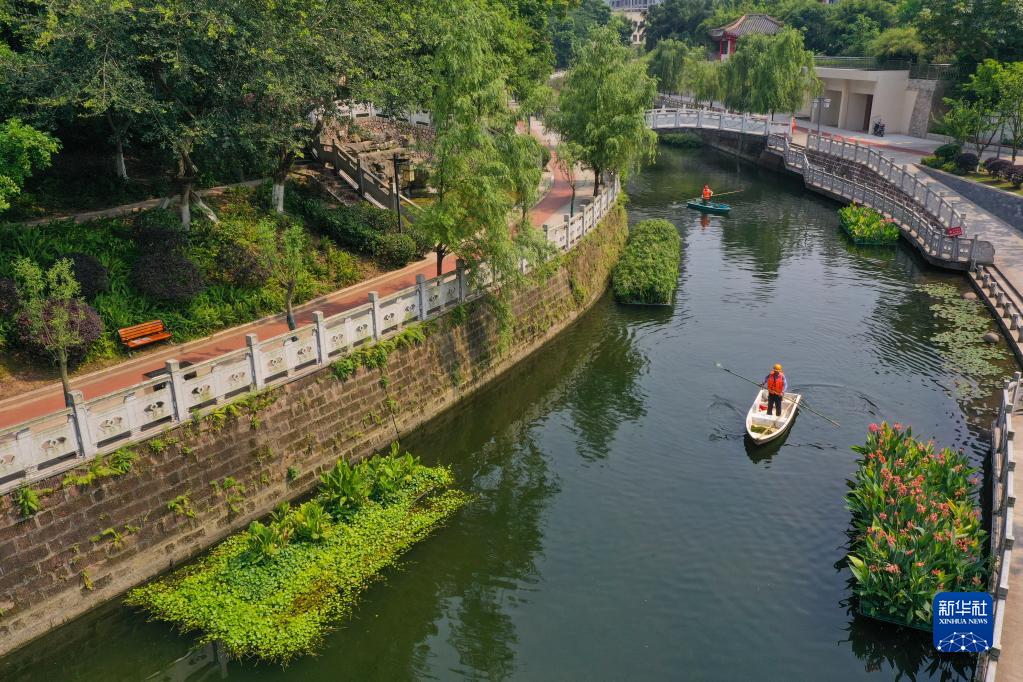 5月7日,工作人员在重庆永川临江河红旗河段清漂(无人机照片)。新华社记者 王全超 摄