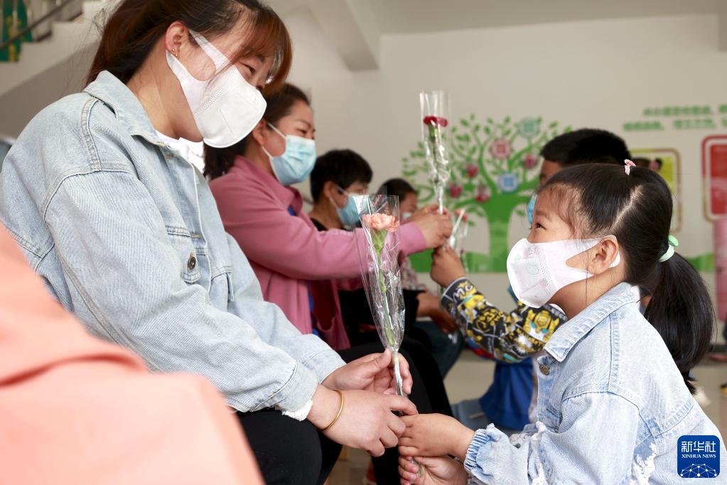 5月8日,在河北省唐山市丰南区岔河镇妇儿活动中心,小朋友们向母亲赠送鲜花。
