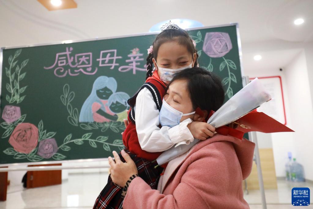 5月8日,在河北省石家庄市桥西区汇通街道东三教华城社区,东三教小学学生为妈妈送上节日祝福并和妈妈深情相拥。