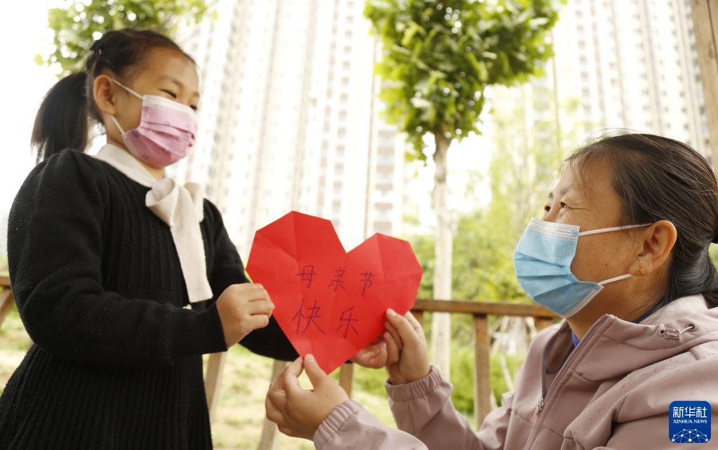 5月8日,在河北省邢台市襄都区大梁庄乡平安路社区,一名儿童给妈妈送上祝福卡。