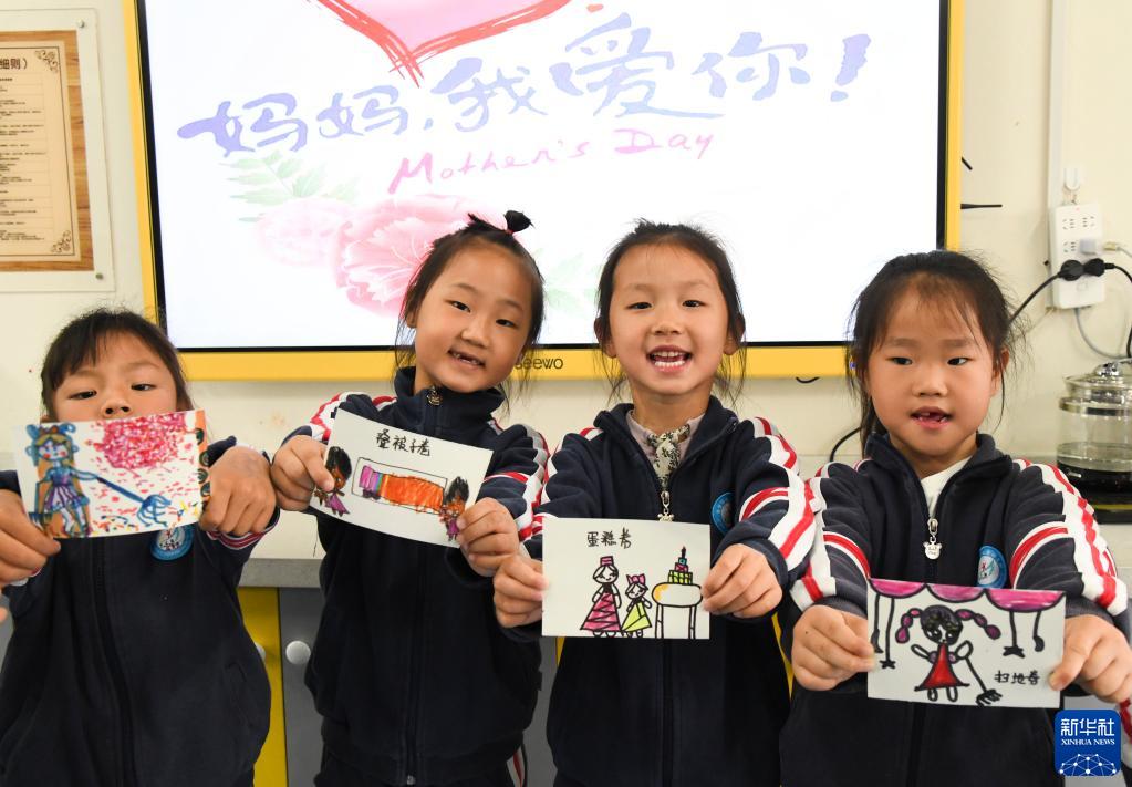 5月8日,河南省济源市天坛路幼儿园的小朋友展示送给妈妈的节日礼物。