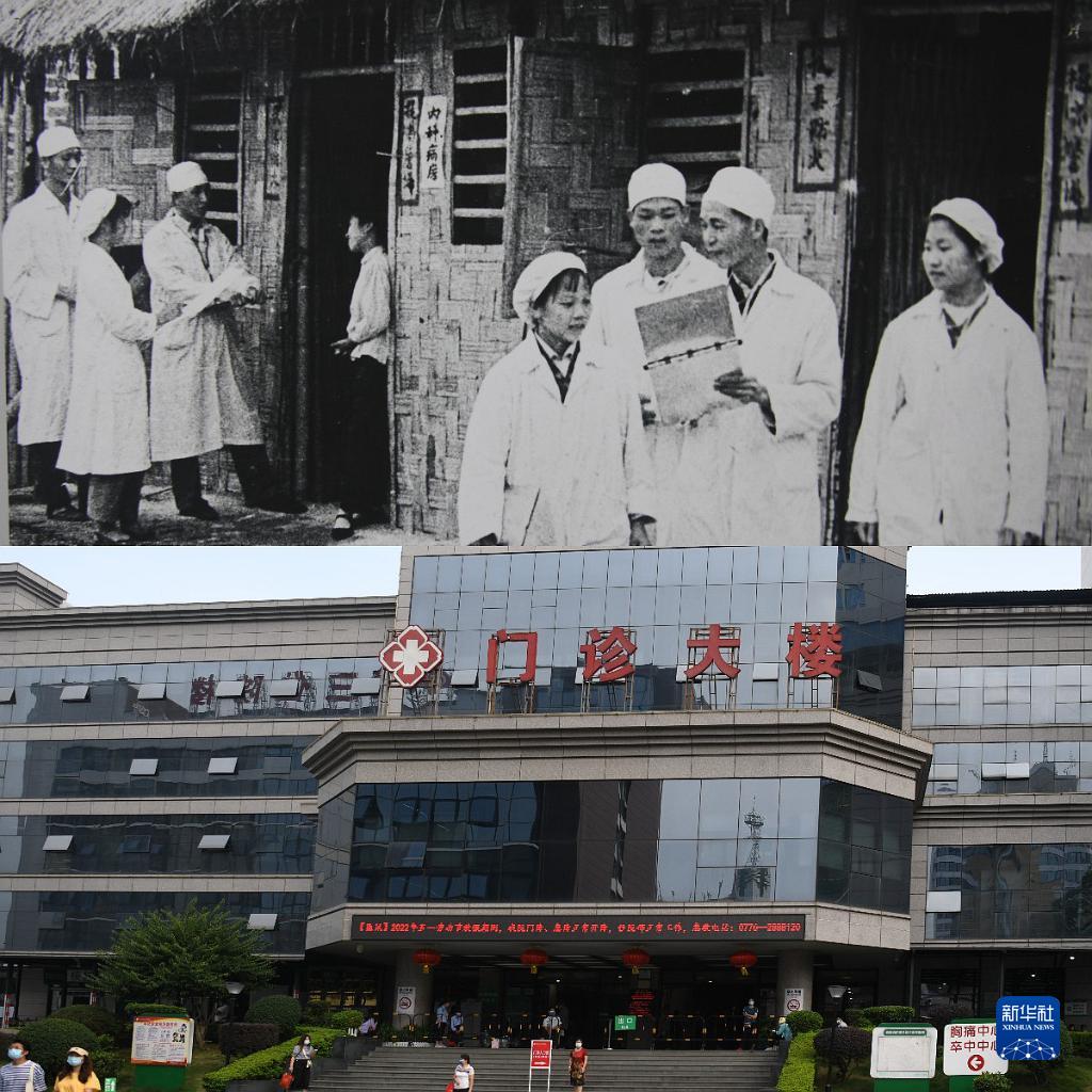 拼版照片:上图为1951年百色市右江民族医院建设初期场景(资料图片,百色市档案馆提供);下图为2022年5月7日拍摄的百色市右江民族医院门诊楼(新华社记者张爱林摄)。