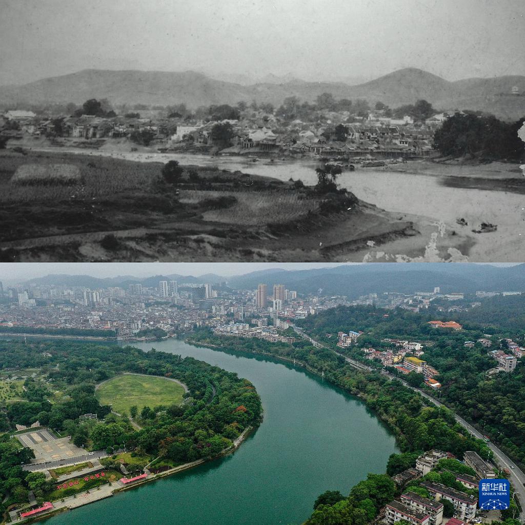 拼版照片:上图为1917年的百色县城(资料图片,百色市档案馆提供);下图为2022年5月8日拍摄的百色市(新华社记者张爱林摄,无人机照片)。