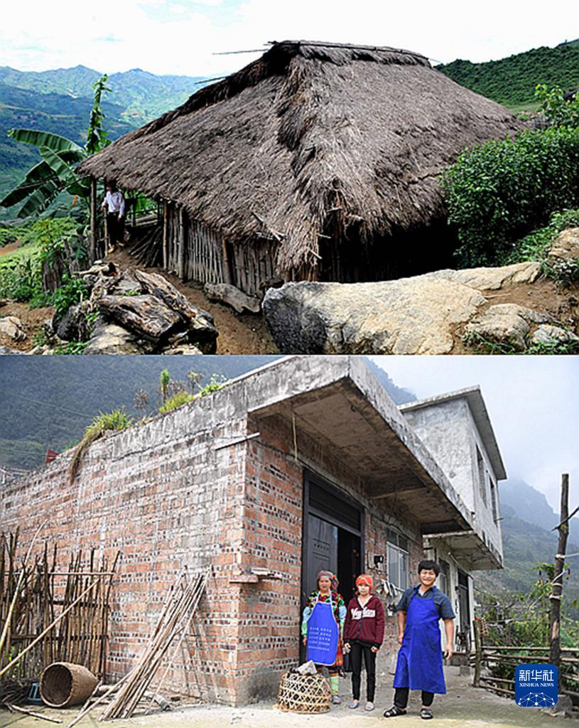 拼版照片:上图为百色市那坡县上保屯村民吴亚路搬迁前的住房(2008年5月26日摄);下图为吴亚路搬迁后居住的楼房(2018年4月24日摄)。