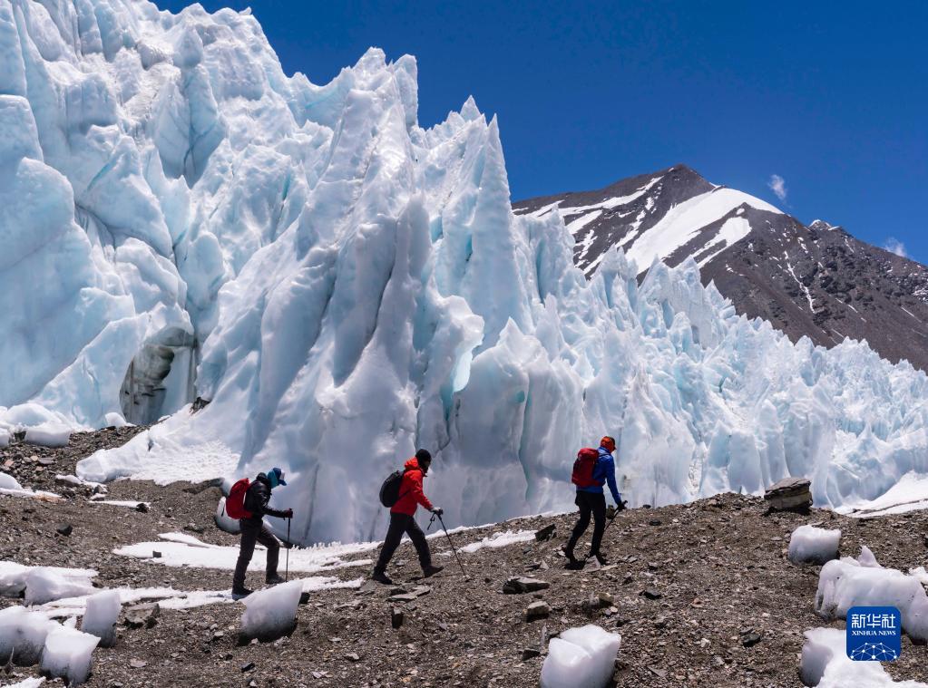 德庆欧珠(右一)在珠峰海拔6000米左右的绒布冰川冰塔林间徒步(2019年5月21日摄)。
