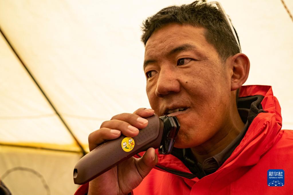 德庆欧珠返回珠峰大本营后整理仪容(5月7日摄)。