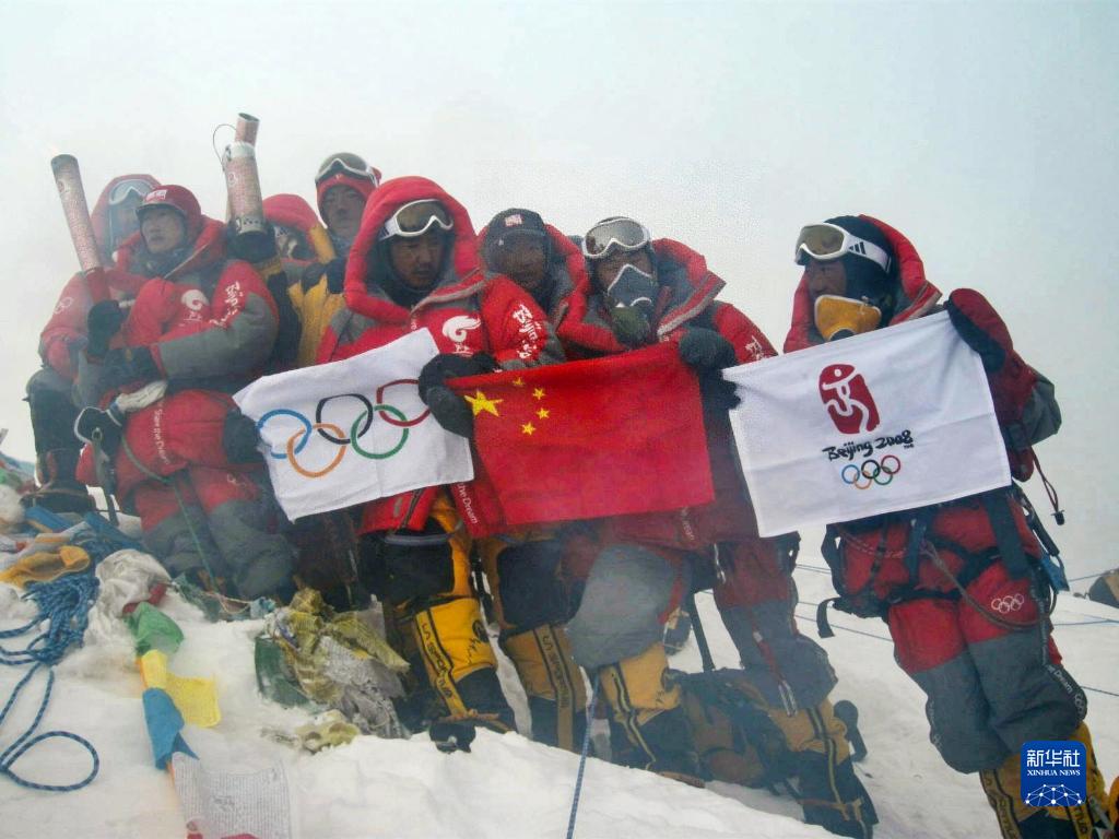 2008年5月8日,北京奥运圣火珠峰传递登山队成功登顶珠峰,德庆欧珠(右五)与队友在峰顶展示中国国旗、奥运五环旗和北京奥运会会徽旗。