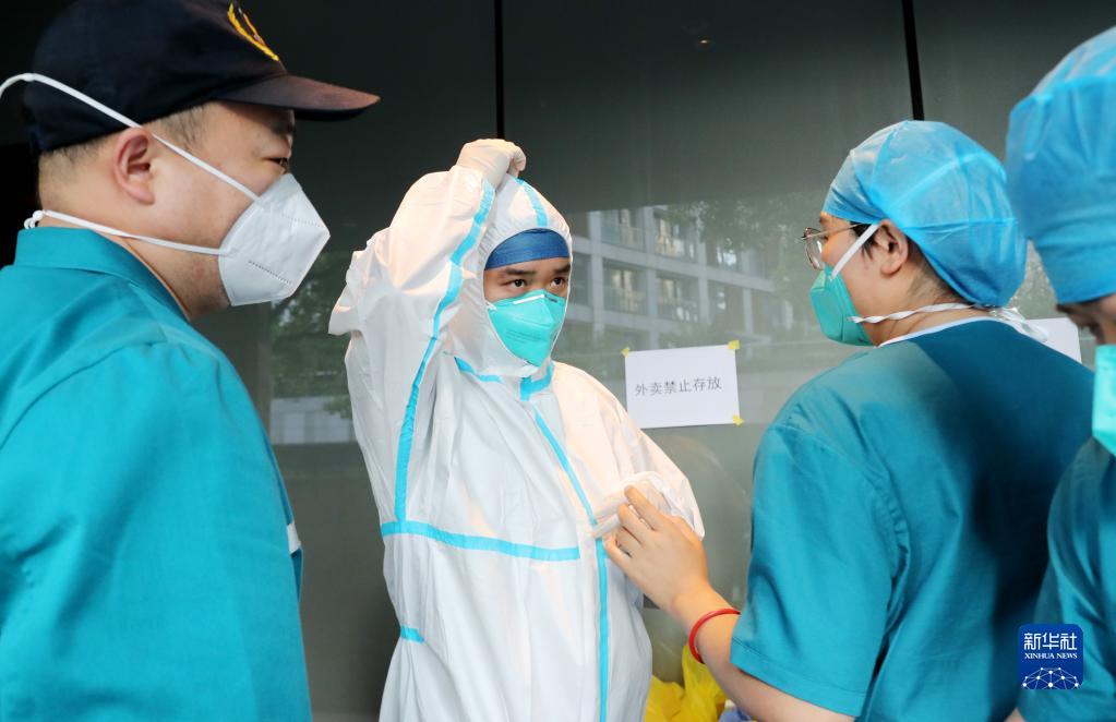 5月8日,一位队员(左二)在驻地外穿防护服准备出发执行转运任务。