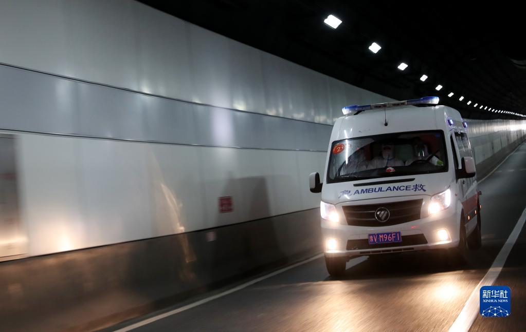 5月8日,转运急救车行驶在上海浦东至浦西的隧道内。