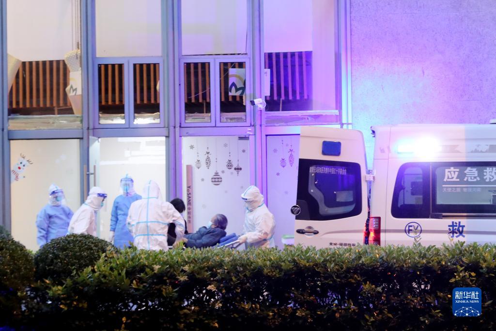 5月8日,转运队员使用担架帮助行动不便的老人上车。
