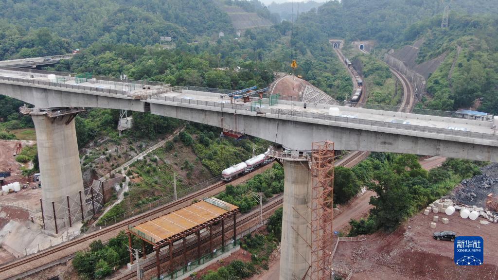 转体后的广汕高铁跨京九铁路特大桥连续梁(5月9日摄,无人机照片)。