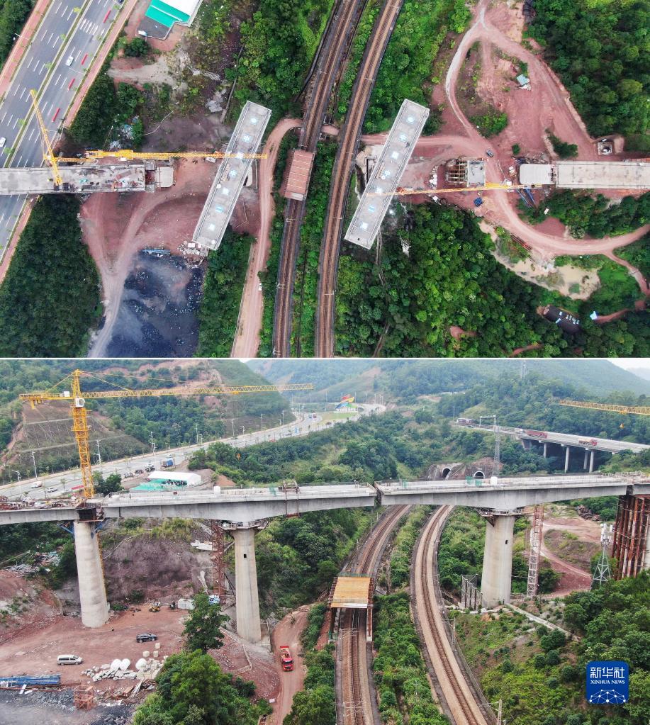 拼版照片:上图为转体前的广汕高铁跨京九铁路特大桥连续梁(5月8日摄,无人机照片);下图为转体后的广汕高铁跨京九铁路特大桥连续梁(5月9日摄,无人机照片)。