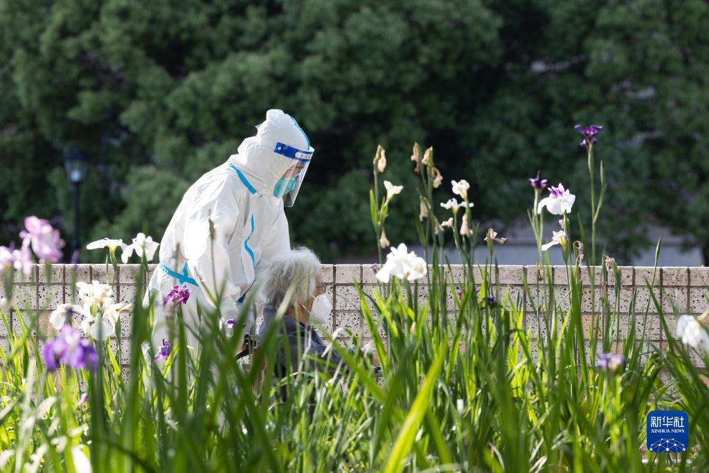5月8日,在上海市黄浦区外滩街道北京里小区消杀期间,工作人员安排一名老人前往临时休息点休息。