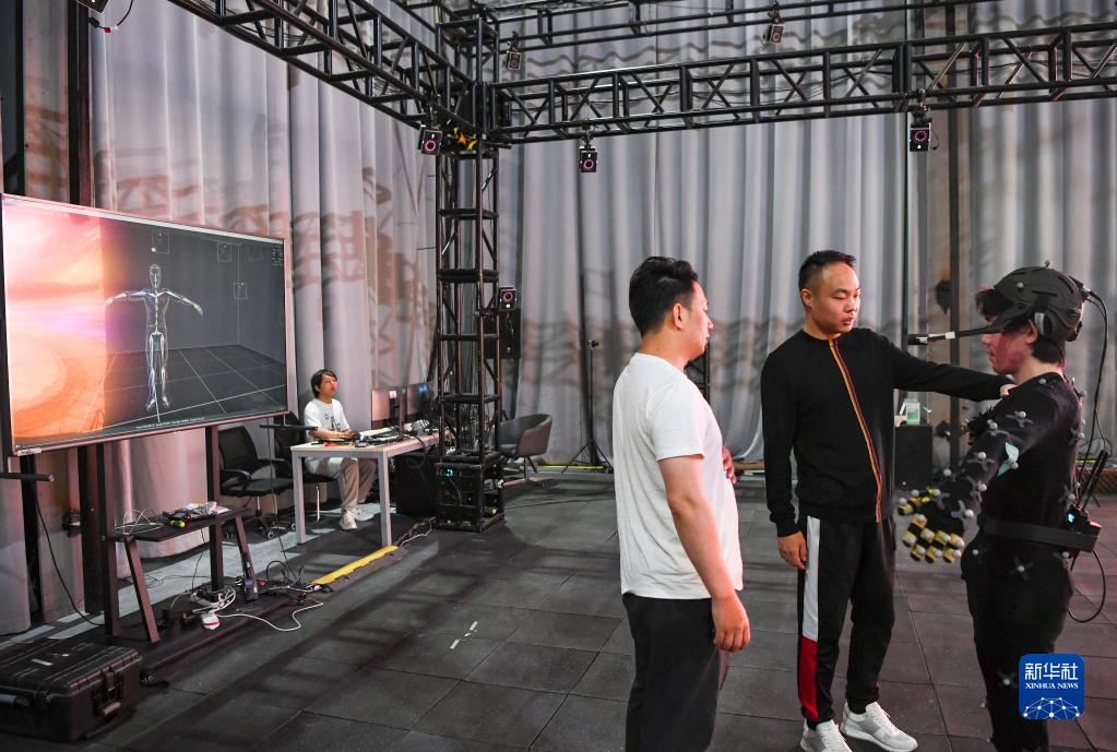 5月6日,在位于重庆云谷·永川大数据产业园的达瓦影像科技虚拟摄影棚,卢琪(右二)与工作人员交流。