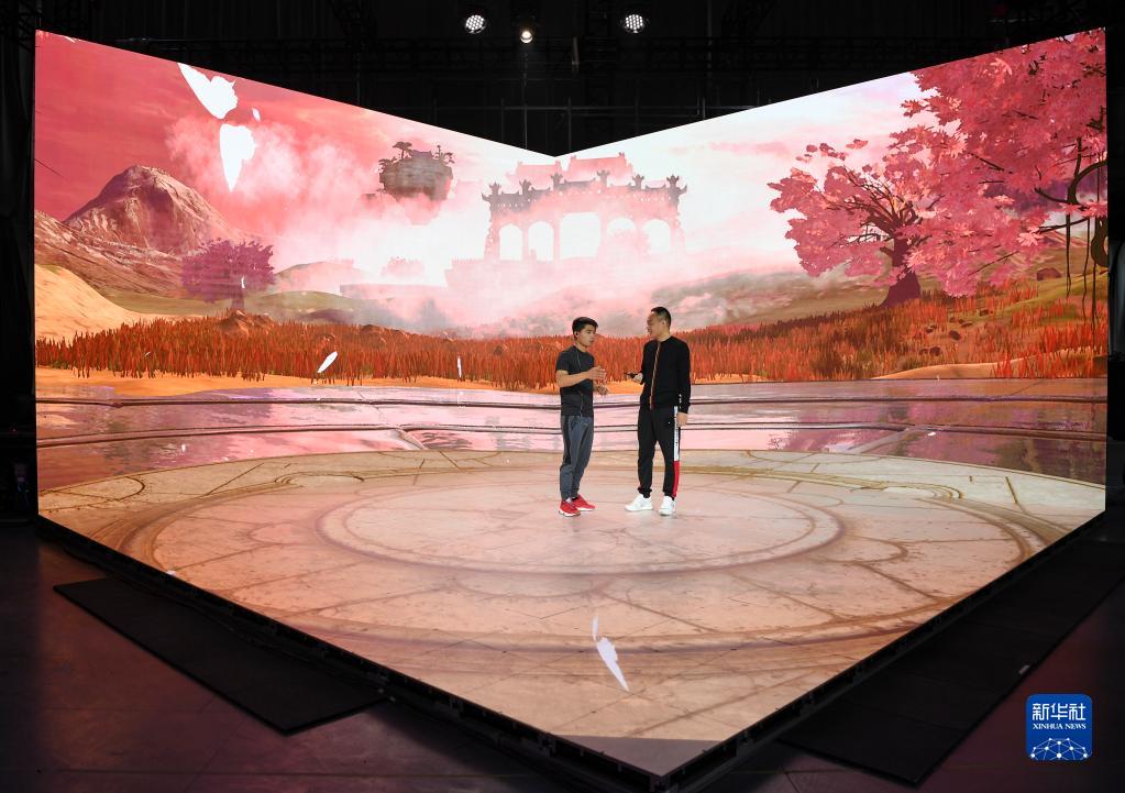 5月6日,在位于重庆云谷·永川大数据产业园的达瓦影像科技虚拟摄影棚,卢琪(右)与工作人员交流。